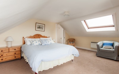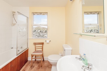 Upstairs there is one double bedroom with ensuite bathroom, a further double bedroom, a twin bedroom and another bathroom with spectacular views over the strand.
