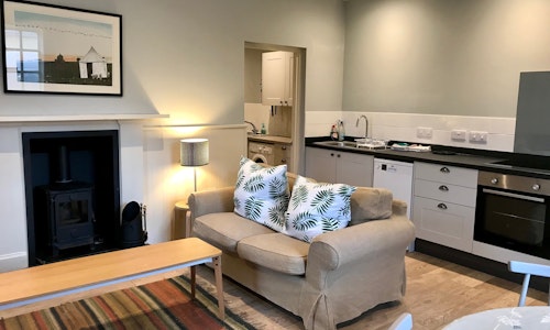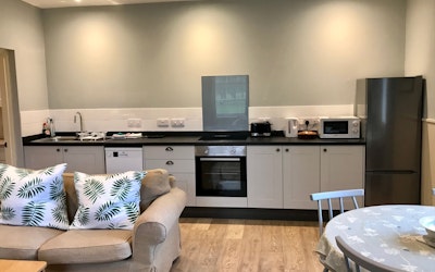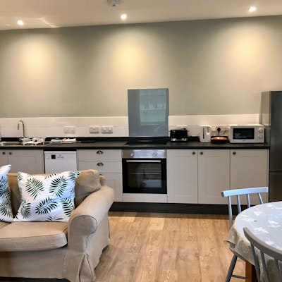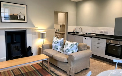 This apartment has a large kitchen, dining and sitting room. It has a dishwasher in its fully equipped kitchen area.