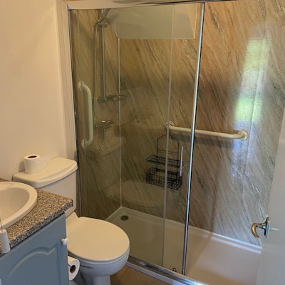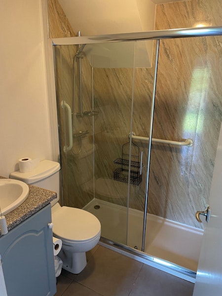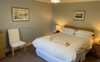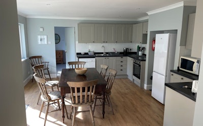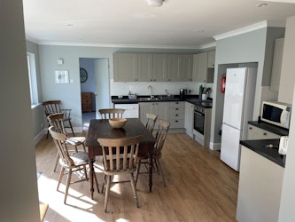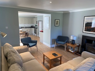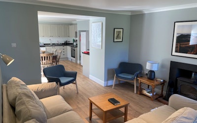 The open plan comfortable sitting room is at the far end of the kitchen. There are also 2 double bedrooms and 2 bathrooms, one ensuite. There is a separate laundry utility room.