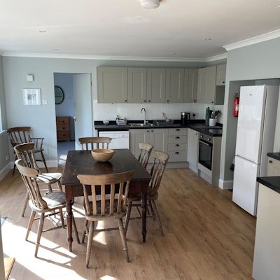 On the ground floor there is a large well equipped kitchen and dining room with french doors leading onto a sunny sheltered terrace.