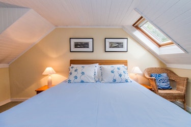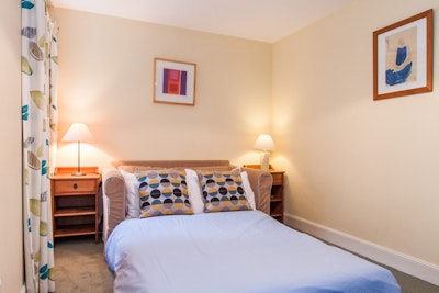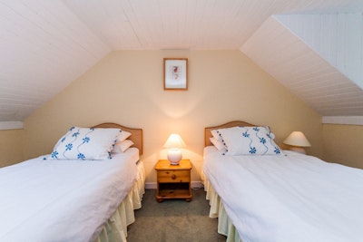 Upstairs there is one double bedroom and one twin bedroom, both attic rooms have dormer windows.