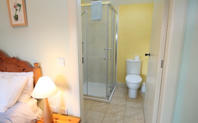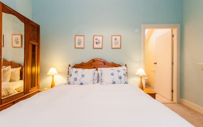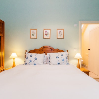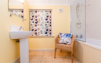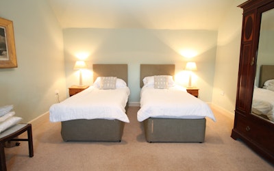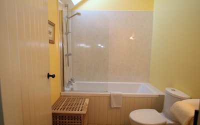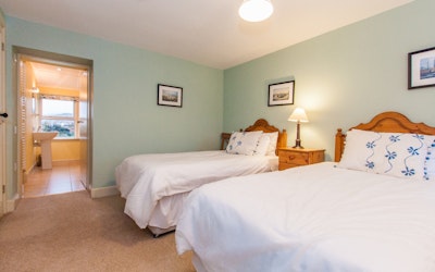Upstairs there is a double bedroom with en suite shower room, a double bedroom with ensuite bathroom, a large bedroom with twin beds that can be zipped together to make a double if required. This bedroom has 2 additional pull out beds for children. There is a separate bathroom with shower across the hall.