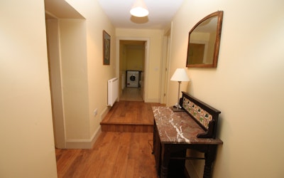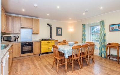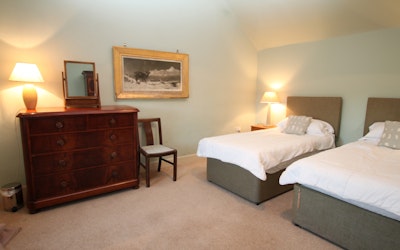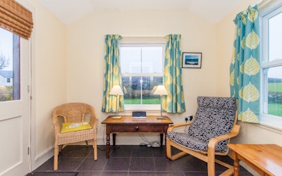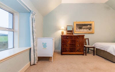 On the ground floor there is a large kitchen/dining room, a sitting room with an open fire, a twin bedroom with an ensuite bathroom with shower and bath. There is a laundry room with a toilet and a boot room. A large and sunny front porch doubles as a small study.