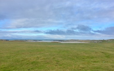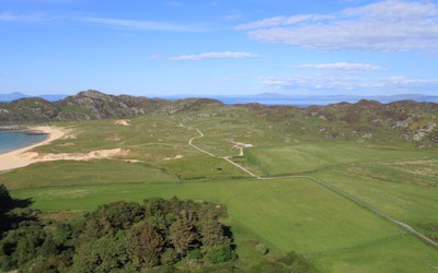 The 18-hole course is situated on indigenous machair, shortish grass growing in sandy soil, typical of the finest Scottish links golf courses. When you arrive at the first tee, you will be struck by the beauty of the course’s setting. Two beautiful, sandy Hebridean bays form the western fringe of the course. Two burns traverse the course from east to west. From many points on the course, you can glimpse the sands of Ardskenish peninsular to the southwest. 20 miles out in the Atlantic Ocean (next stop, Canada), in most weathers, you can spot Dubh Hearteach lighthouse. The panorama is completed by Dun Ghallain, a cairned headland where a mediaeval fort once stood.